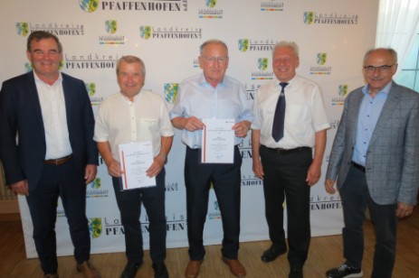 Foto (v. l.) LR Albert Gürtner, Albert Schmelzer, Hans Halbritter, Günther Thaller (1. Vors.) und Bgm. Hubert Attenberger.