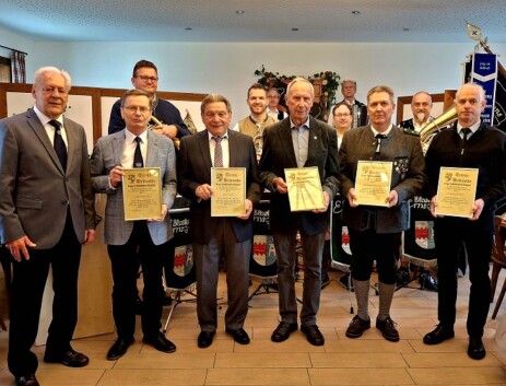 Der Vereinsvorsitzende Günther Thaller mit den beim Jahrtag anwesenden Geehrten Alois Schmelzer (50 Jahre), Felix Amann (50), Lutz Nehring (50), Hermann Schien jun. (25), Armin Mayerhofer (10).